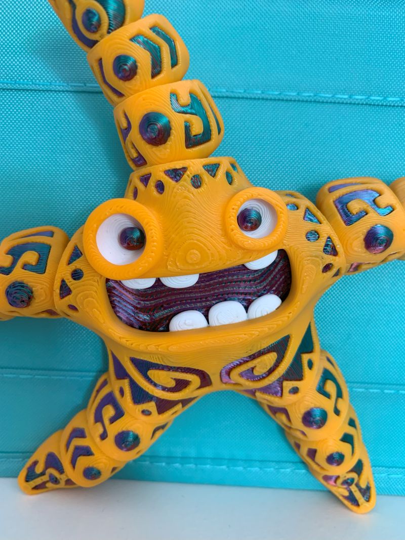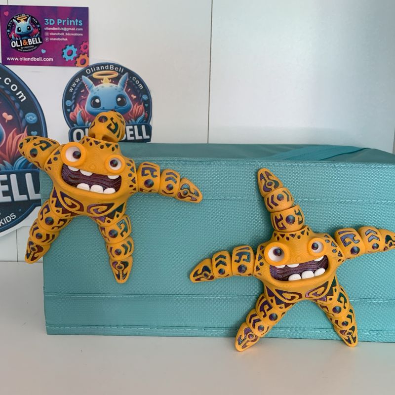 Say hello to your new wiggly desk buddy! This flexi 3D printed starfish is bursting with personality—printed in sunshine yellow and adorned with a shimmering, iridescent tribal pattern that catches the light like ocean magic. Its bendy, tactile design makes it irresistibly fun to fidget with, pose, or simply admire.